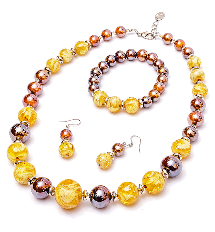 Set tvoria sklenené perly guľatých tvarov v oranžovo-hnedých odtieňoch, ktoré majú krásny odlesk.