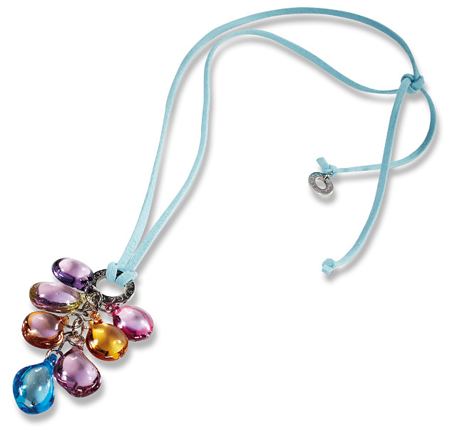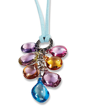 Náhrdelník tvorí textílna šnúrka bledo modrej farby na konci ktorej je prívesok z rôznofarebných sklenených slzičiek.