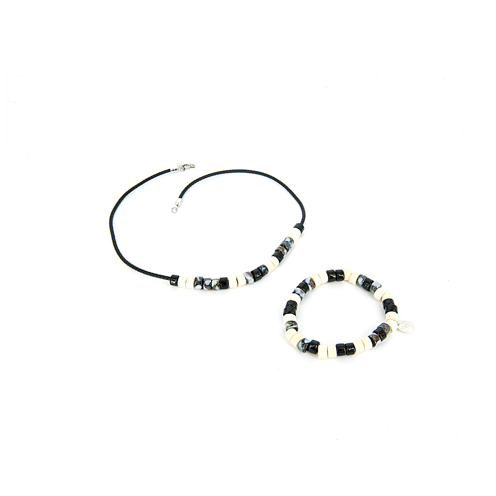 Náhrdelník je z hrubšej kože na ktorej sú malé sklenené koráliky v zaujímavom farebnom prevedení. Fotografia má ilustračný charakter a náramok nieje súčasťou, ale dá sa osobitne zakúpiť.
