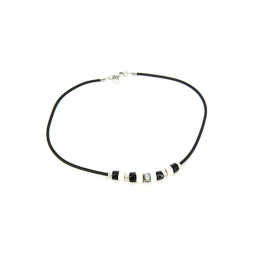 Náhrdelník je z hrubšieho kaučuku na ktorom je viacero sklenených komponentov. Dominantnou farbou je čierna, ktorá je doplnená bielou a šedou.