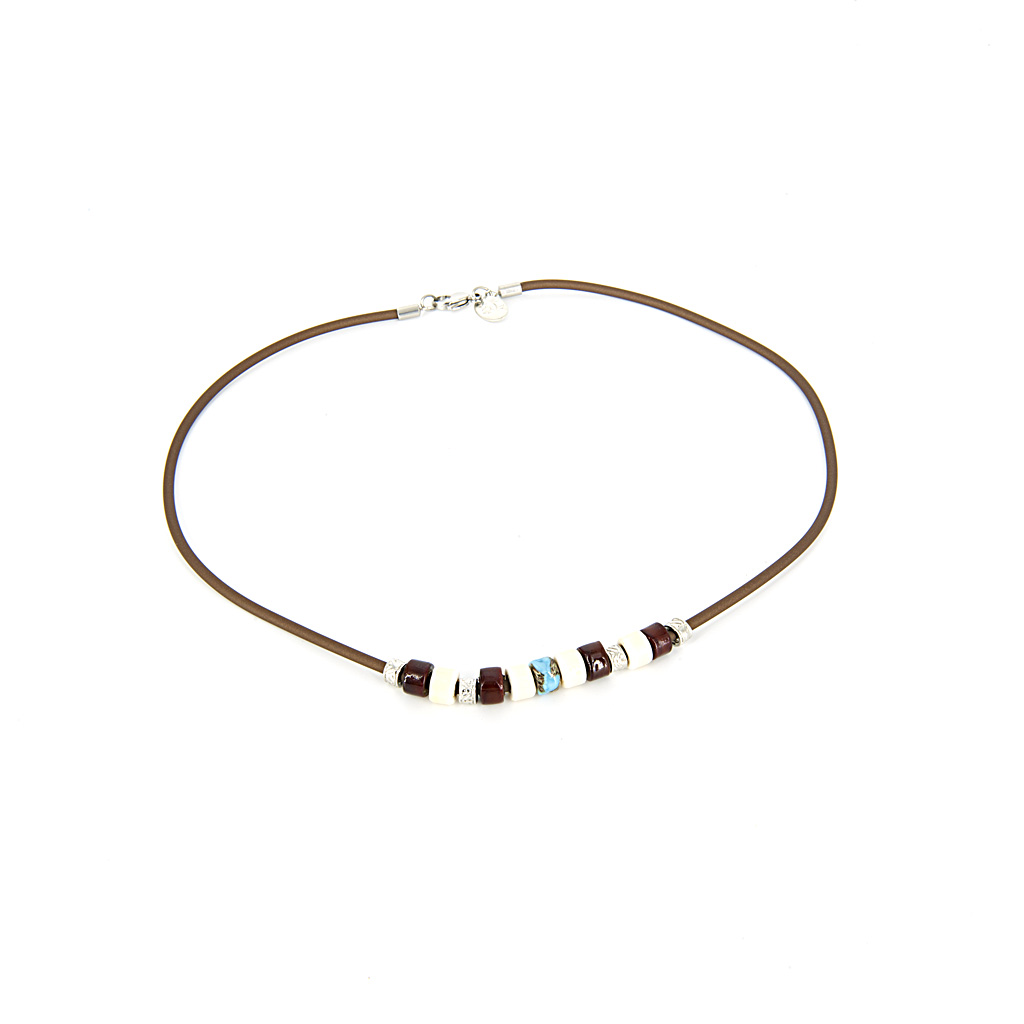 Náhrdelník je z hrubšieho kaučuku na ktorom je viacero sklenených komponentov. Dominantnou farbou je hnedá, ktorá je doplnená bielou a tyrkysovou.
