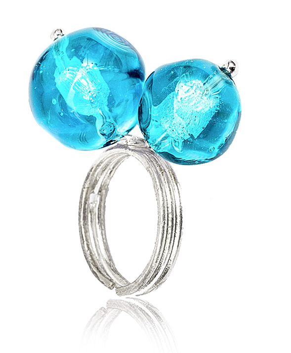 Adeona prsteň značky Millefiori je ručne vyrobený z muránskeho skla. Prsteň sa skladá zo striebornej obruče, na ktorej sú dve sklenené guličky - väčšia a menšia. Samotné komponenty sú číre a krásne v nich vyniká modro-tyrkysová farba. Veľkosť prsteňa je regulovateľná.
