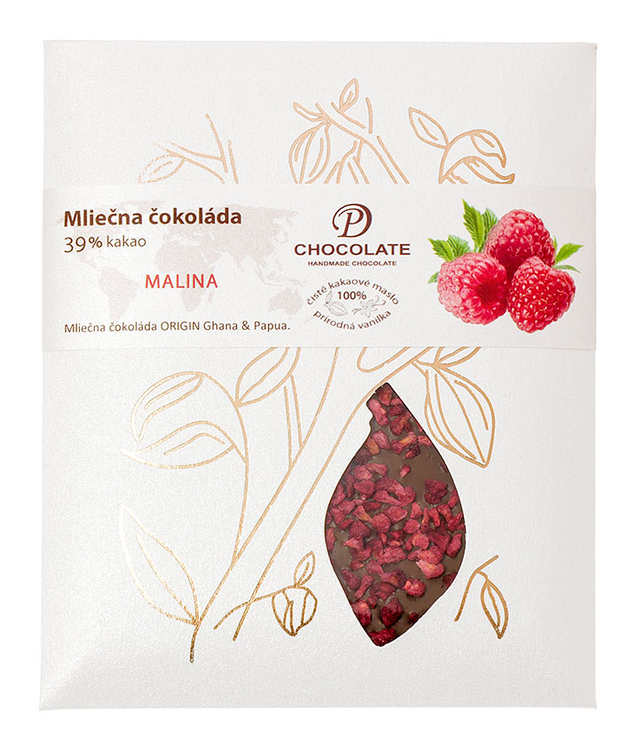 Ručne robená čokoláda vyrobená na Slovensku. Zaujímavá kombinácia mliečnej čokolády s lahodnými malinami. Čokoláda je vďaka svojej kvalite a zároveň vkusnému baleniu vhodným darčekom pre tých najnáročnejších.