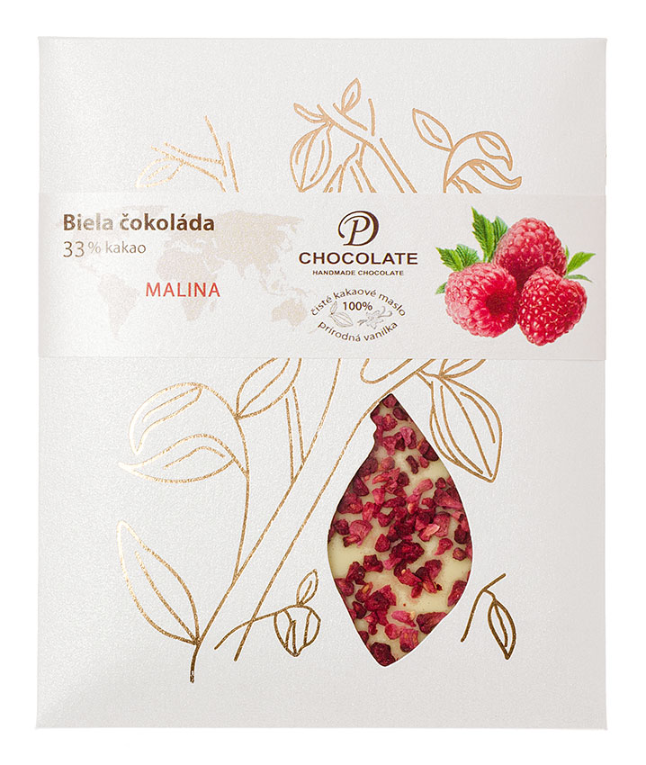 Ručne robená čokoláda vyrobená na Slovensku. Zaujímavá kombinácia mliečnej čokolády s lahodnými malinami. Čokoláda je vďaka svojej kvalite a zároveň vkusnému baleniu vhodným darčekom pre tých najnáročnejších.