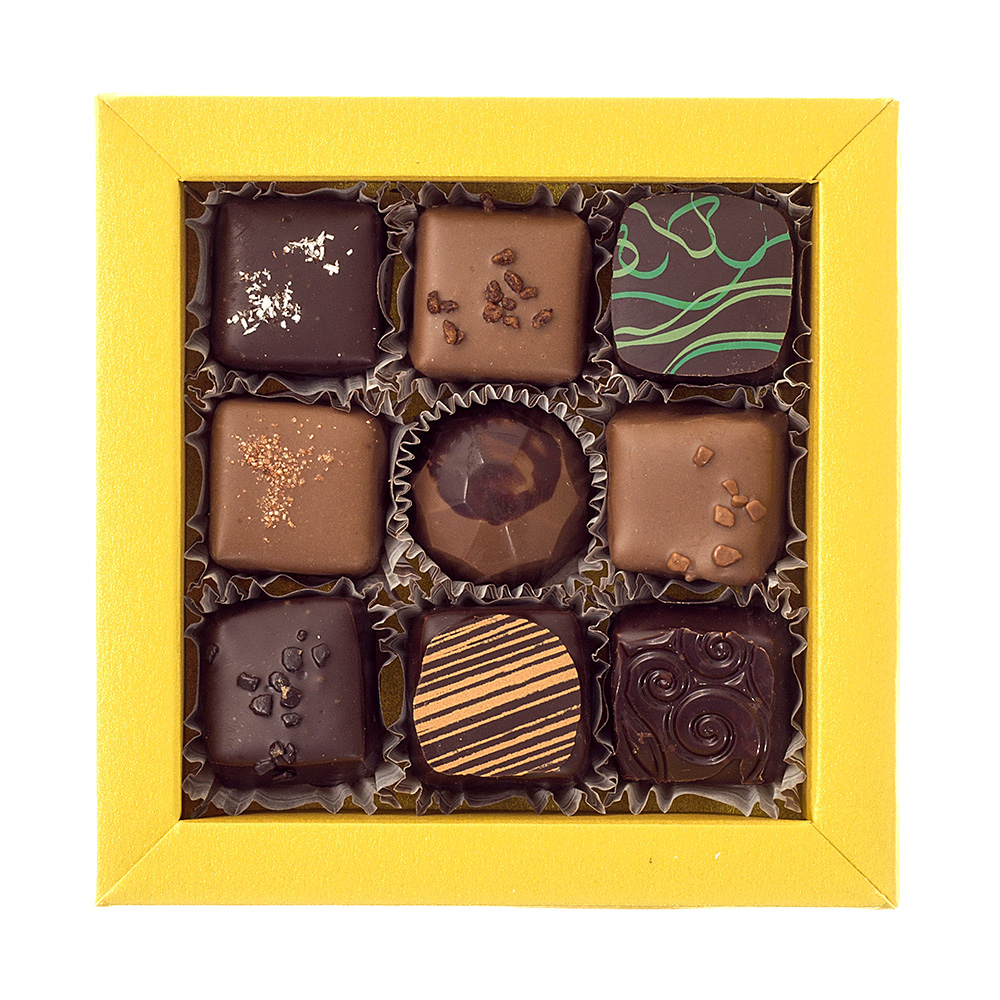 Zloženie: Mliečna čokoláda: cukor, kakaové maslo, sušené plnotučné mlieko, kakaová masa, prírodná vanilka, emulgátor: sója lecitín. Obsah kakaovej sušiny najmenej 39%. Horká čokoláda: kakaová masa, cukor, kakaové maslo, prírodná vanilka, emulgátor: sójový lecitín. Obsah kakaovej sušiny najmenej 72%. Náplň: cukor, kakaové maslo, plnotučné sušené mlieko, kakaová masa, emulgátor: sójový lecitín, prírodná vanilka, pasta praline (lieskové orechy 50%, cukor, sójový lecitín), dezertná pasta pomaranč (cukor, glukózovo-fruktózový sirup, invertný cukor, pomarančový koncentrát, pomaranč, kyselina citrónová, pektín), lieskové orechy, smotana (smotana 35%, emulgátor: E471, stabilizátor: karagenan), bezvodý mliečny tuk, glukózový sirup, stabilizátor: glycerol, stabilizátor: sorbitol, mandle, lieskovo-oriešková pasta, med, cukor, dextróza, maltodextrín, invertný cukor, dezertná pasta cointreau (cointreau, etylalkohol, cukor, zahusťovadlo E466), dezertná pasta rum (voda, rum, cukor, karamel, xanthan), dezertná pasta citrón (voda, cukor, kyselina citrónová, modifikované škroby E1422, E1450, pomarančový džús koncentrát, citrónová šťava koncentrát, zahusťovadlo xanthan, sušené odstredené mlieko, mliečny tuk, maltodextrín), silica mäty piepornej, kokosové mlieko (extrakt kokosového mlieka (82 %), voda, zahusťovadlo E466, cukor, emulgátor E435, kyselina citrónová), gaštanové pyré (jedlé gaštany, cukor, rum, vanilka), kokos strúhaný, káva (obsahuje kofeín), ovocné pyré limetka, soľ, škorica.