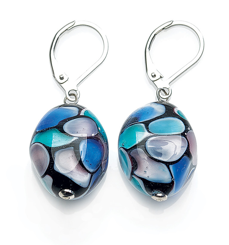 Náušnice su v odtieňoch modrej a zeleno-ružovo-šedo-čiernej farby vo forme farebných fliačikov v sklenených komponentoch s veľmi zaujímavým zapracovaním v rôznych veľkostiach.