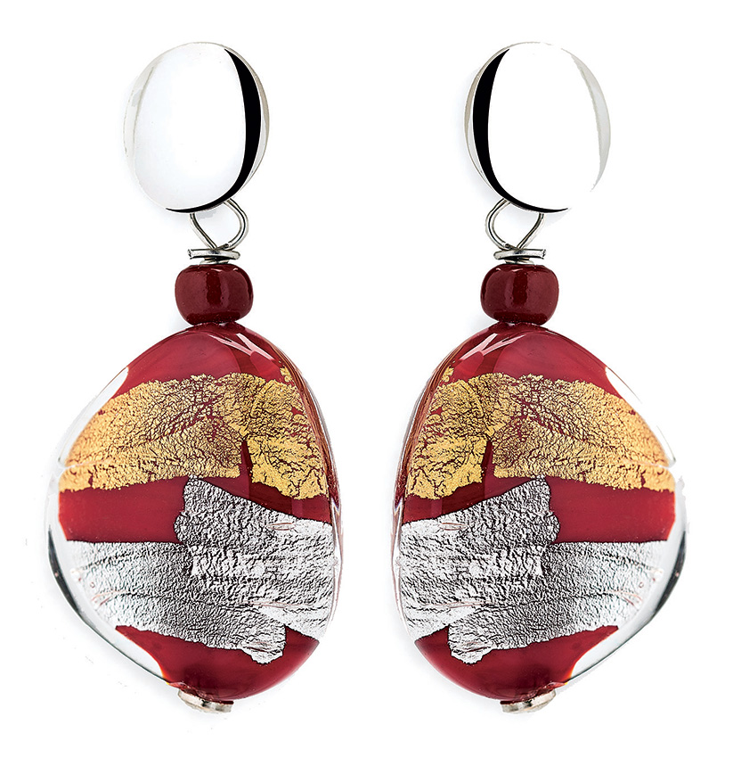 Náušnice sú červenej farby v kombinácii so zlatou 24K a striebornou fóliou zapracovanou do sklenených komponentov. Náušnice vďaka tomu vyzerajú veľmi elegantne a luxusne.