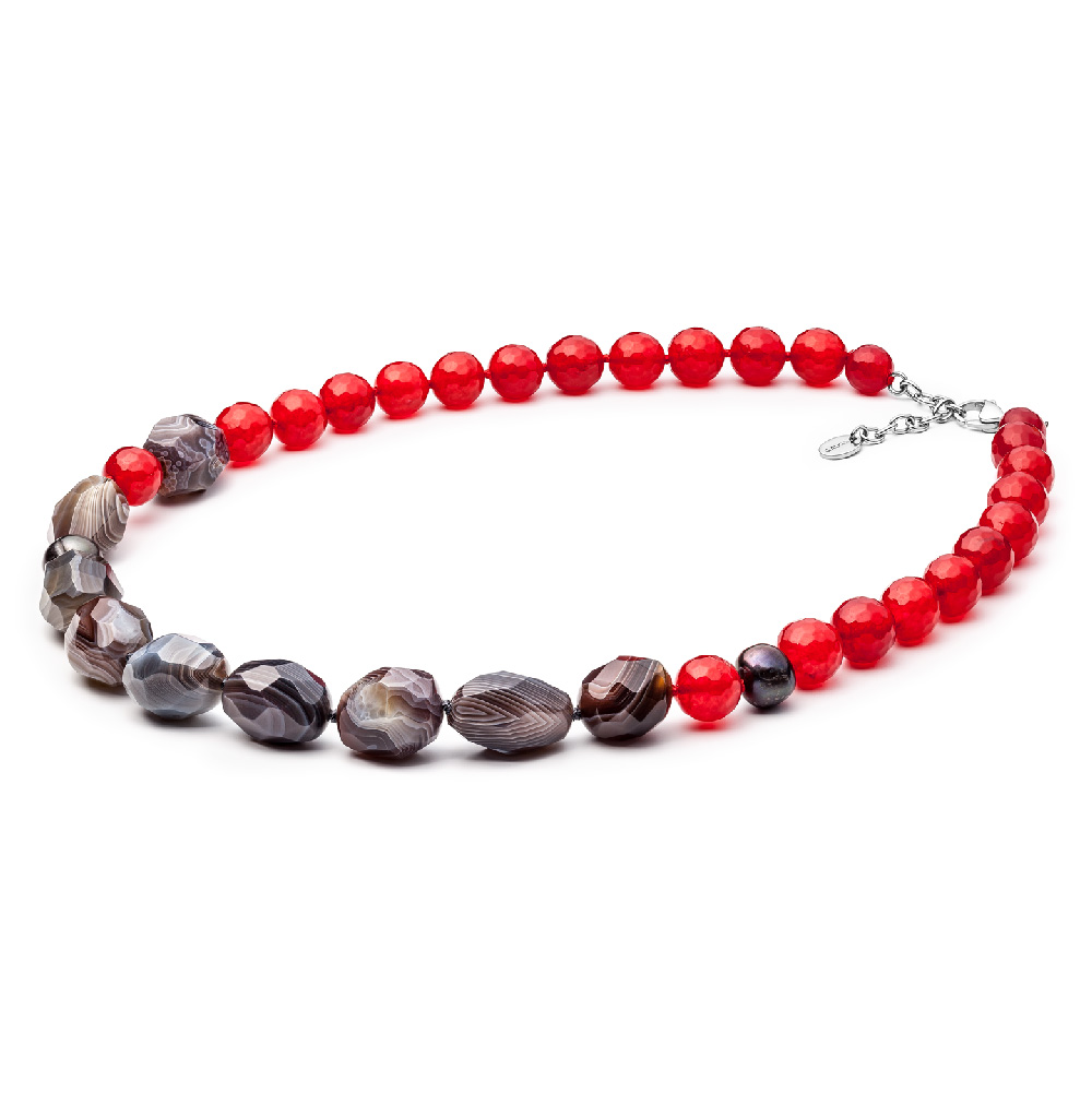 Náhrdelník tvoria kamene achátu a nefritu v červenej a bielo-hnedej farbe doplnené o dve guľaté riečne perly šedej farby vo veľkosti 10–13mm.