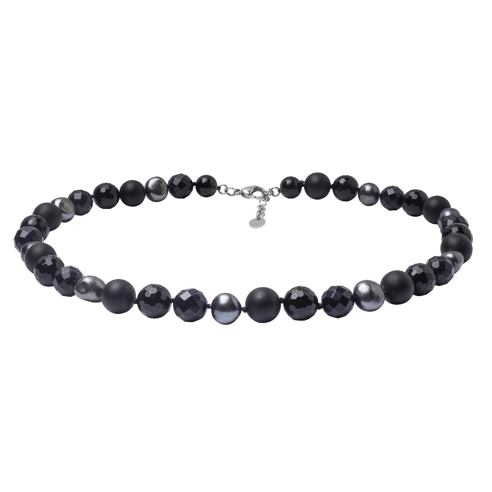 Náhrdelník tvoria minerály rôznych tvarov – ónyxy, imitácia aventurínu a perly – čiernej farby.