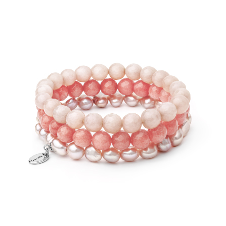 Náramok tvoria keshi perly v bielych a ružových odtieňoch doplnené o biele kamene nefritu vo veľkosti cca 8 – 10 mm.