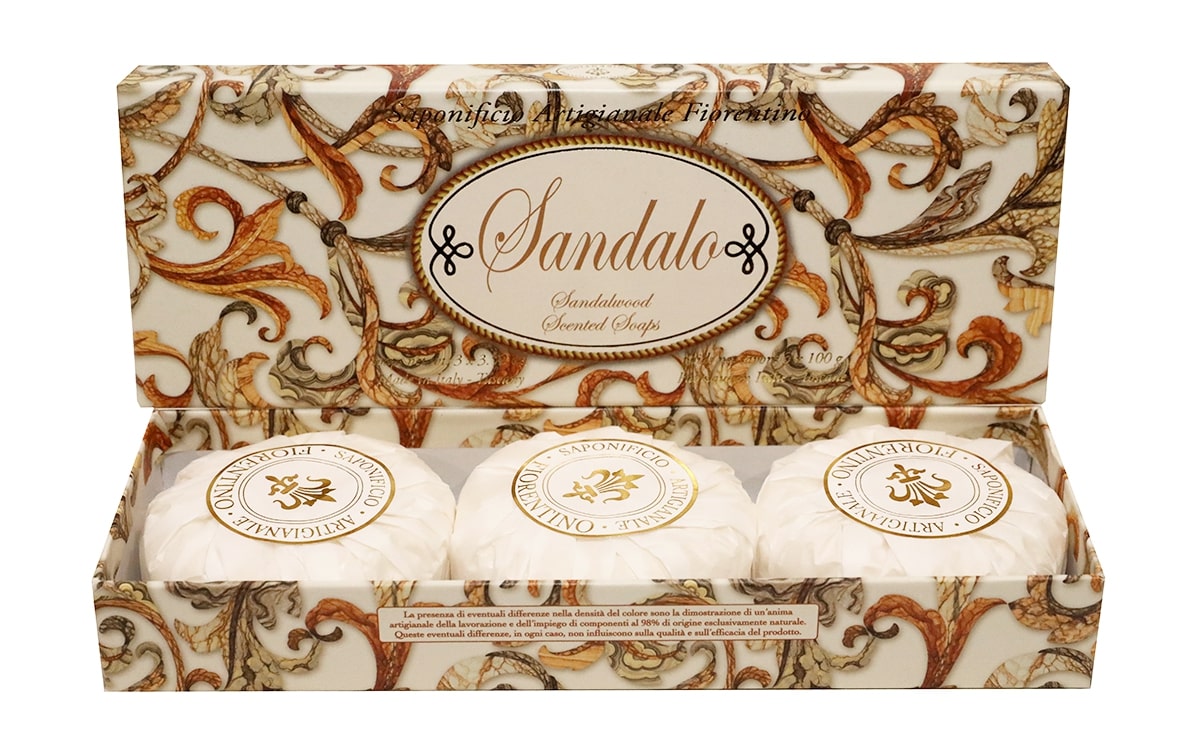 Nádherne voňajúce prírodné mydlo s vôňou santálového dreva. Ručne robené, talianske, prírodné mydielka Fiorentino sú balené v kvalitnej darčekovej krabičke.