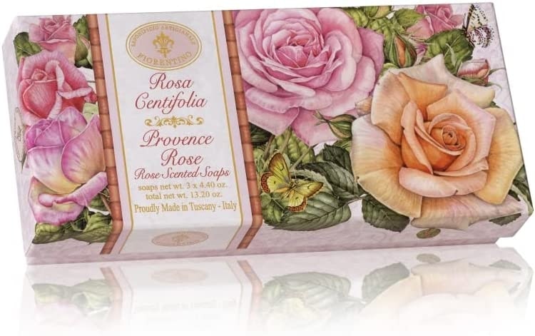 Nádherne voňajúce prírodné mydlo s vôňou ruže. Ručne robené, talianske, prírodné mydielka Fiorentino sú balené v kvalitnej darčekovej krabičke.